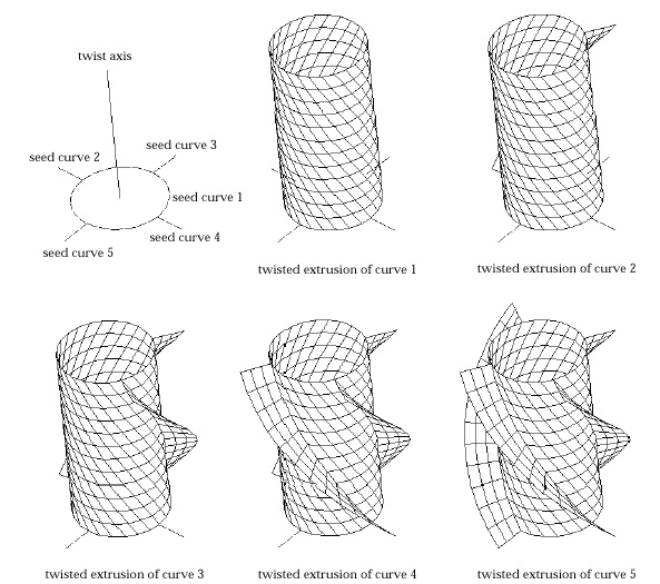 this twisted extrusion, the trace of a node on the seed curve makes a helix