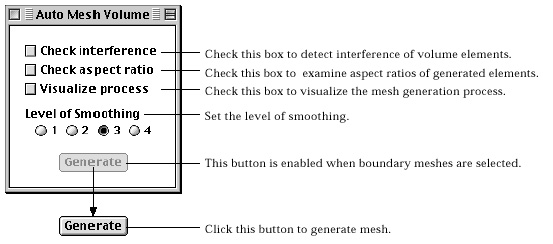 In the above procedure, the order of step 2), 3) and 4) can be interchanged. You may repeat the above procedure of generating a mesh by automatic tetrahedronization without issuing the command again, while "Auto Mesh Volume" dialog remains on the screen. This mesh generation command is terminated by closing the dialog box or issuing any other command. Automatic tetrahedronization usually takes a long time. While mesh generation is progressing, its status is indicated by a progress bar.