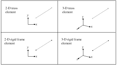 There are 4 types of frame elements as shown below, namely 2-D truss, 3-D truss, 2- D frame and 3-D frame. The element type is determined by the problem setup. Identical procedures are applied for frame element generation re g a rdless of the element type.